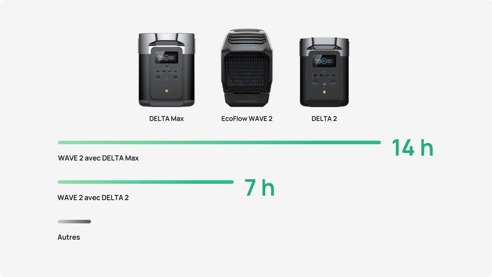 Le WAVE 2 n'est qu'un début. Associez-le à une EcoFlow DELTA 2 / DELTA Max ou à une batterie supplémentaire pour bénéficier d'une autonomie exceptionnelle de 7 à 14 h en mode Eco. C'est 28 % plus efficace qu'avec d'autres stations électriques portables. Vous pouvez également utiliser n'importe quelle station électrique portable avec une entrée 820 W pour recharger votre WAVE 2.