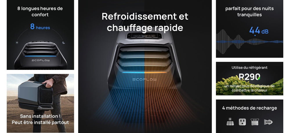 Avec le algorithme logiciel avancé d'EcoFlow, le WAVE 2 offre plusieurs modes de fonctionnement et se contrôle via une application. Il fonctionne silencieusement (44 dB) en mode veille et jusqu'à 8 heures en mode Eco. Profitez longtemps d'un grand confort dans votre tente, votre camping-car ou votre maison grâce avec cet appareil puissant et portable.